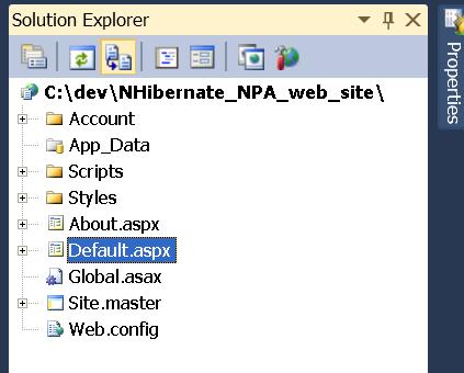 A web site with basic features is created. The ‘Solution Explorer’ view will look like this: